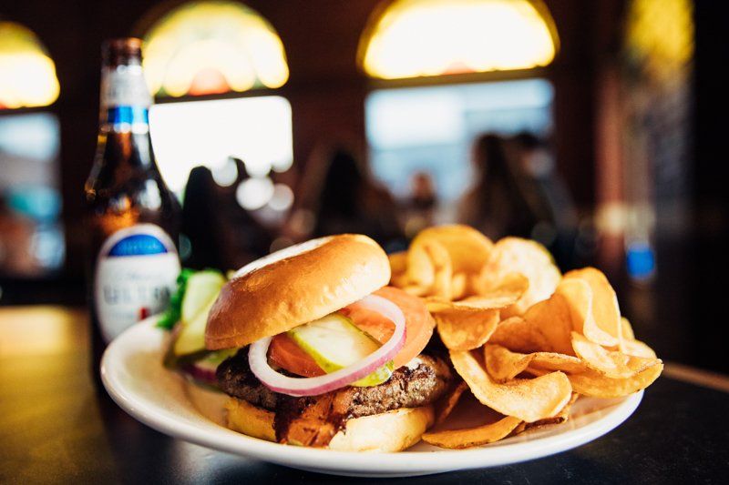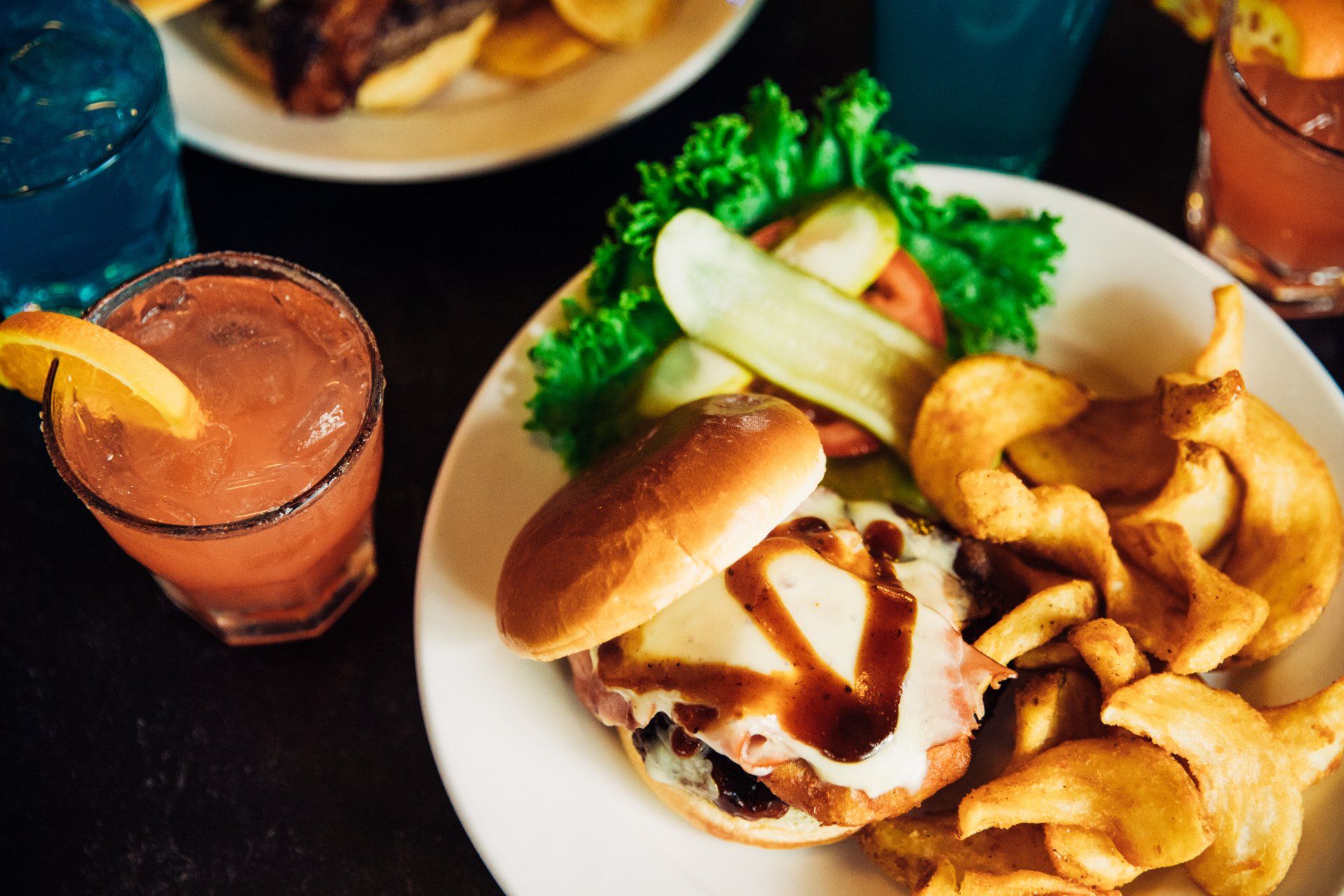 All served with chips, fries, sweet potato waffle fries. (with cinnamon sugar), or coleslaw. Substitute calico beans, small salad, beer battered onion rings, soup of the day or chili – Additional 1.79 Substitute a gluten free bun – Additional 1.49 Cheeses: American/Swiss, Smoked Cheddar, Pepper Jack, Bleu Cheese Crumbles