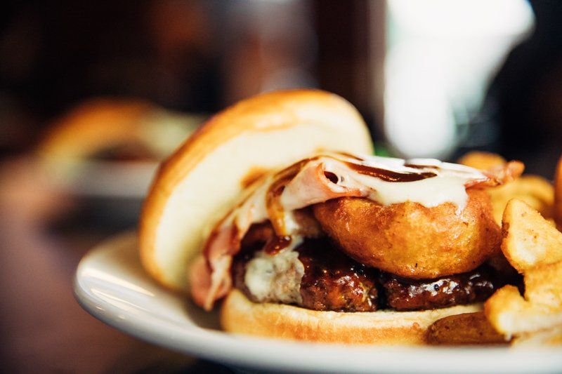 Our burger basted in barbecue sauce topped with a beer battered onion ring, sliced smoked ham and your choice of cheese. Served on a gourmet bun